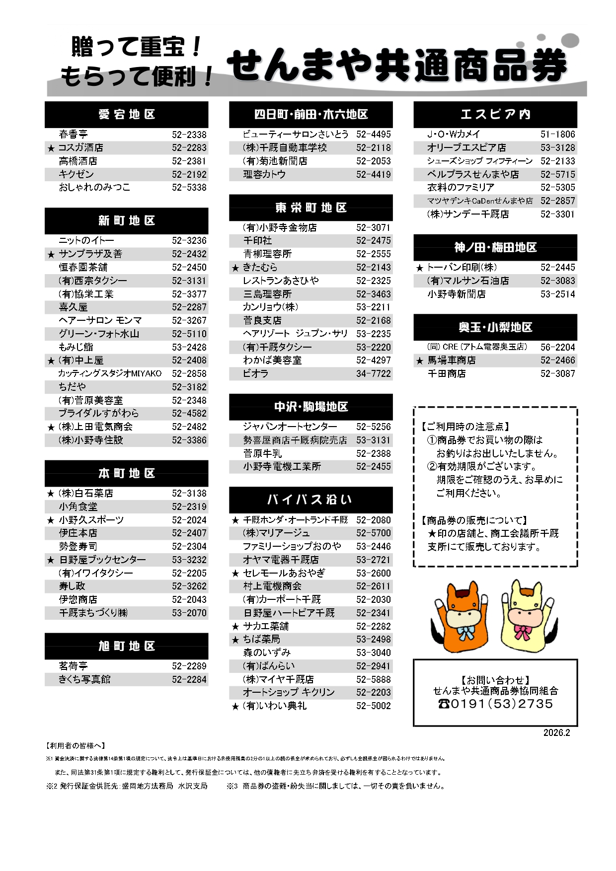 千厩地域にてご利用いただける「せんまや共通商品券」の加盟店一覧を掲載いたしますので、ご確認の上ご利用いただきますよう宜しくお願い致します。