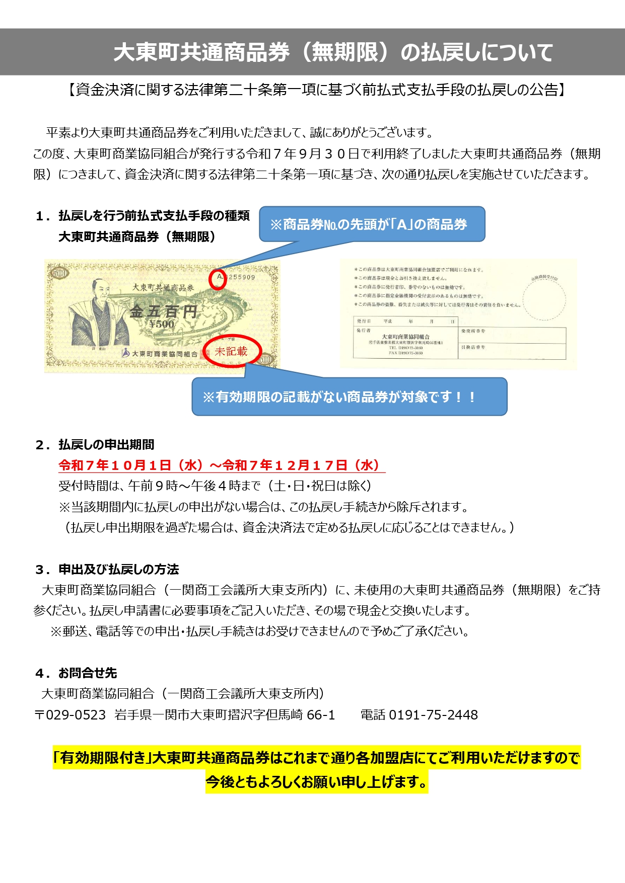 大東町共通商品券(無期限)払戻しのお知らせ2025年10月01日