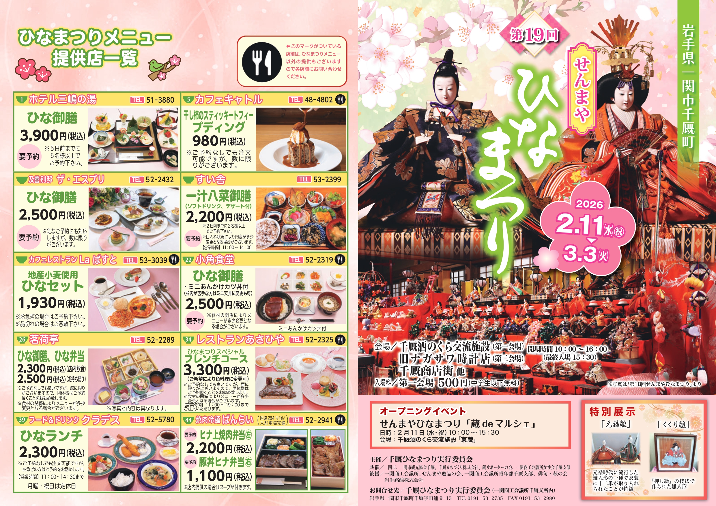 「第19回せんまやひなまつり」が2月11日(水・祝)~3月3日(火)まで千厩酒のくら交流施設、旧ナガサワ時計店、千厩商店街を会場に開催されます。