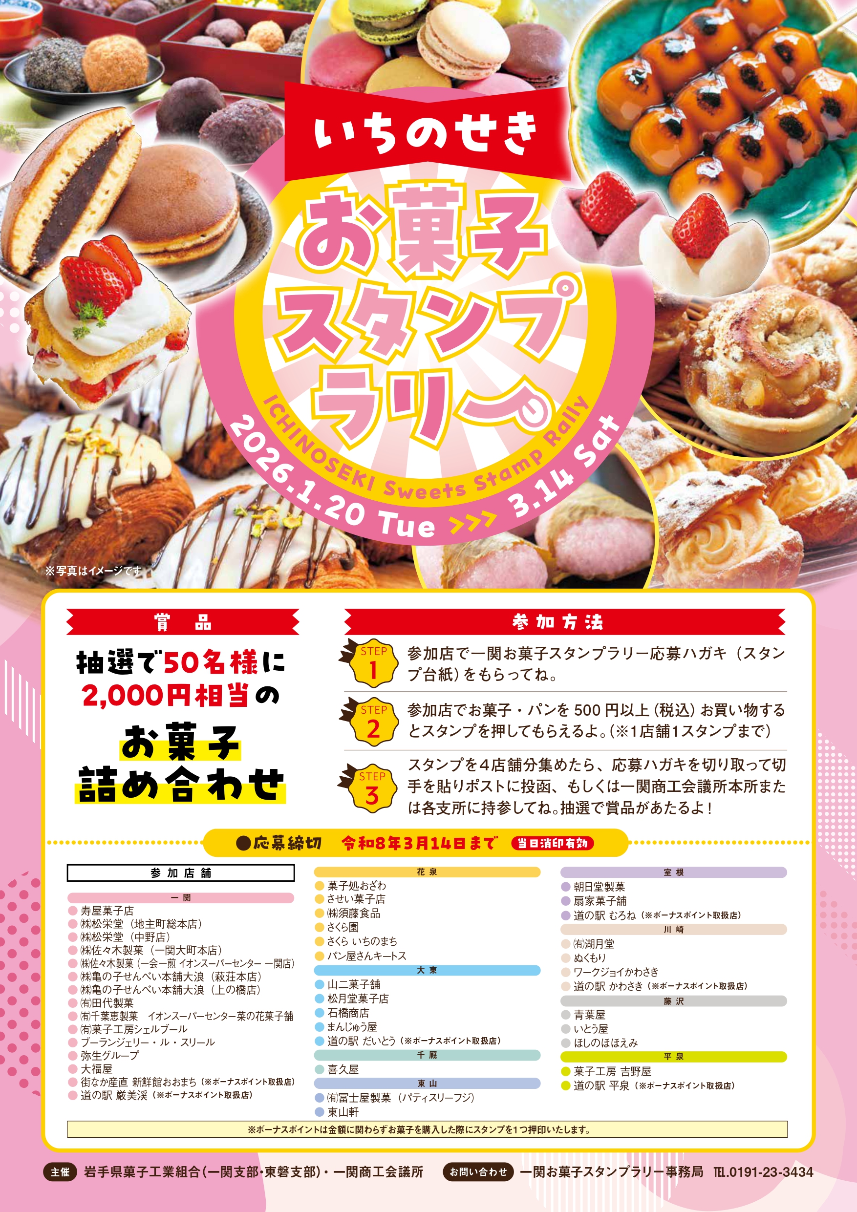 いちのせきお菓子スタンプラリーを開催します。店舗を周ってスタンプを集め、賞品に応募してください!