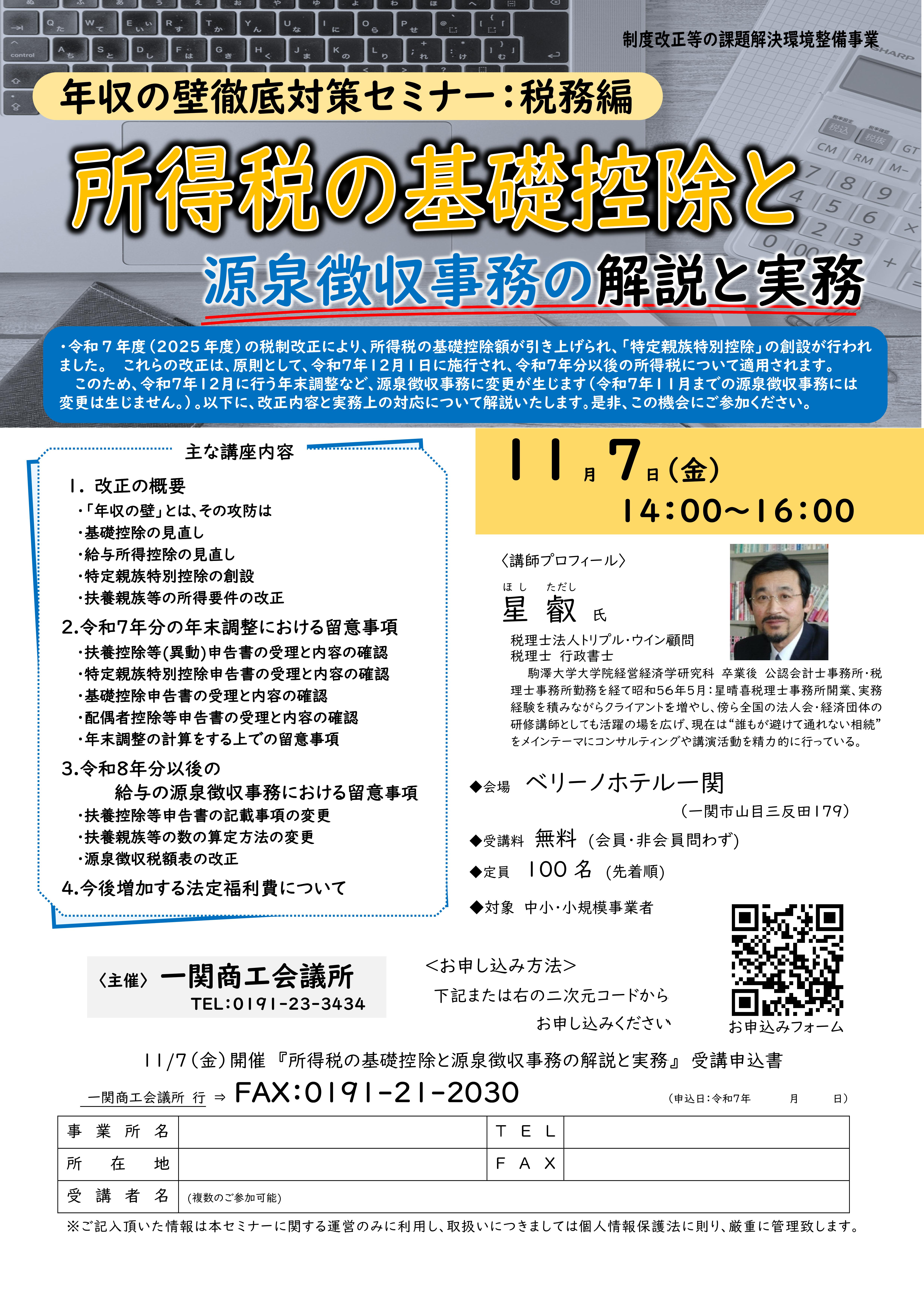 ※会場が変更となりました 11/7 年収の壁徹底対策セミナー税務編 所得税の基礎控除と源泉徴収事務の解説と実務2025年10月24日