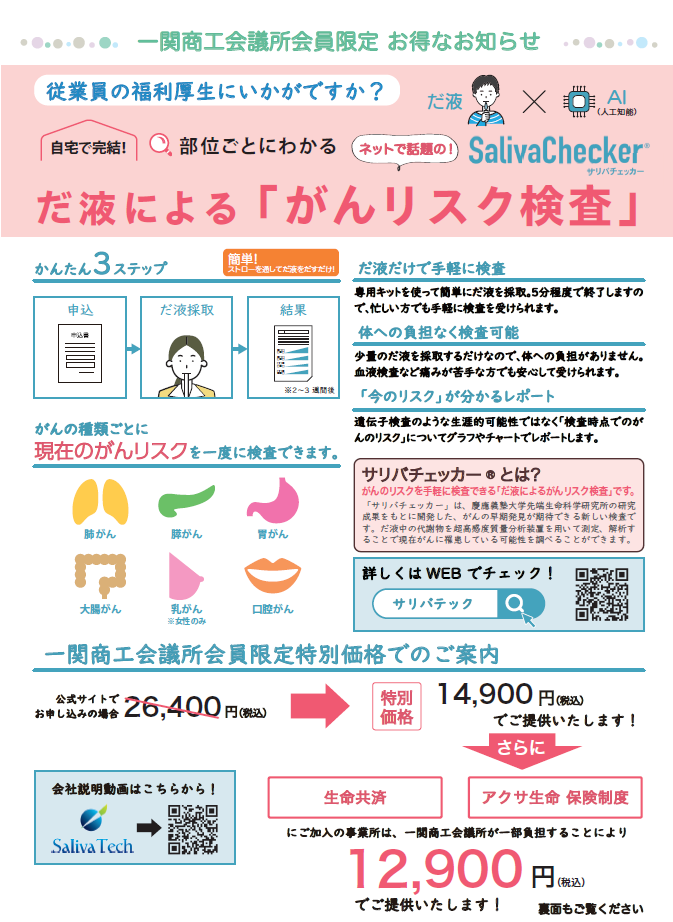 一関商工会議所ホームページ(https://ichinoseki-cci.com/consult/kyousai/index.html)にアクセスし、「共済制度」→「だ液によるがんリスク検査(サリバチェッカー)」から 専用シートをダウンロードし、必要事項をご入力の上、 メールに添付してお送りください。